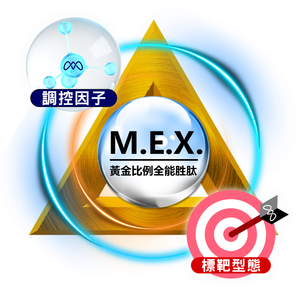 「M.E.X.黃金比例全能胜肽」是以「無細胞療法」為作為研發基礎,由國際知名生醫團隊以獨家幹細胞分泌萃取物所研發的再生醫學核心原料,擁有引領全球獨家製程專利,符合GMP標準。透過專利製程與技術,從間質幹細胞中提取出優質且高度純化的黃金比例全能胜肽。